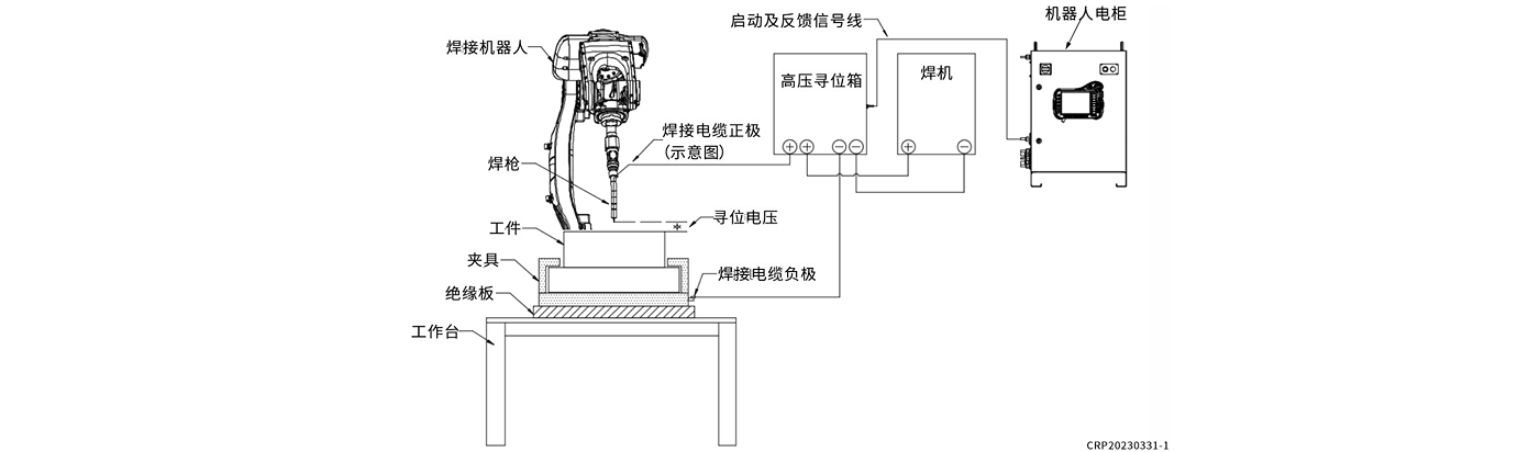 本設(shè)備配合焊接機器人的焊絲尋位功能,反饋焊絲在碰到工件的信號,機器人自動計算位置的偏差,修正位置點,使機器人尋到實際的焊接點。